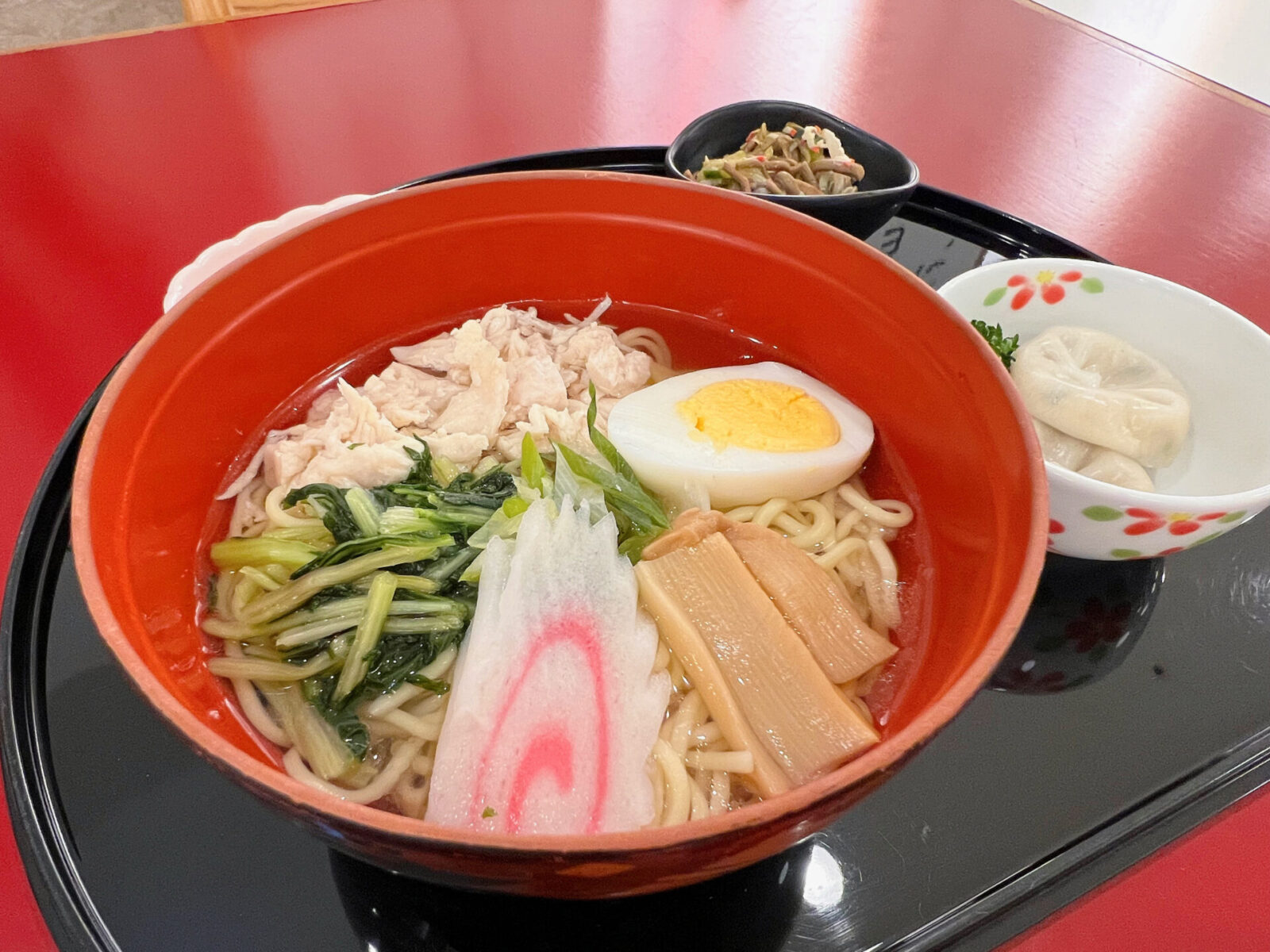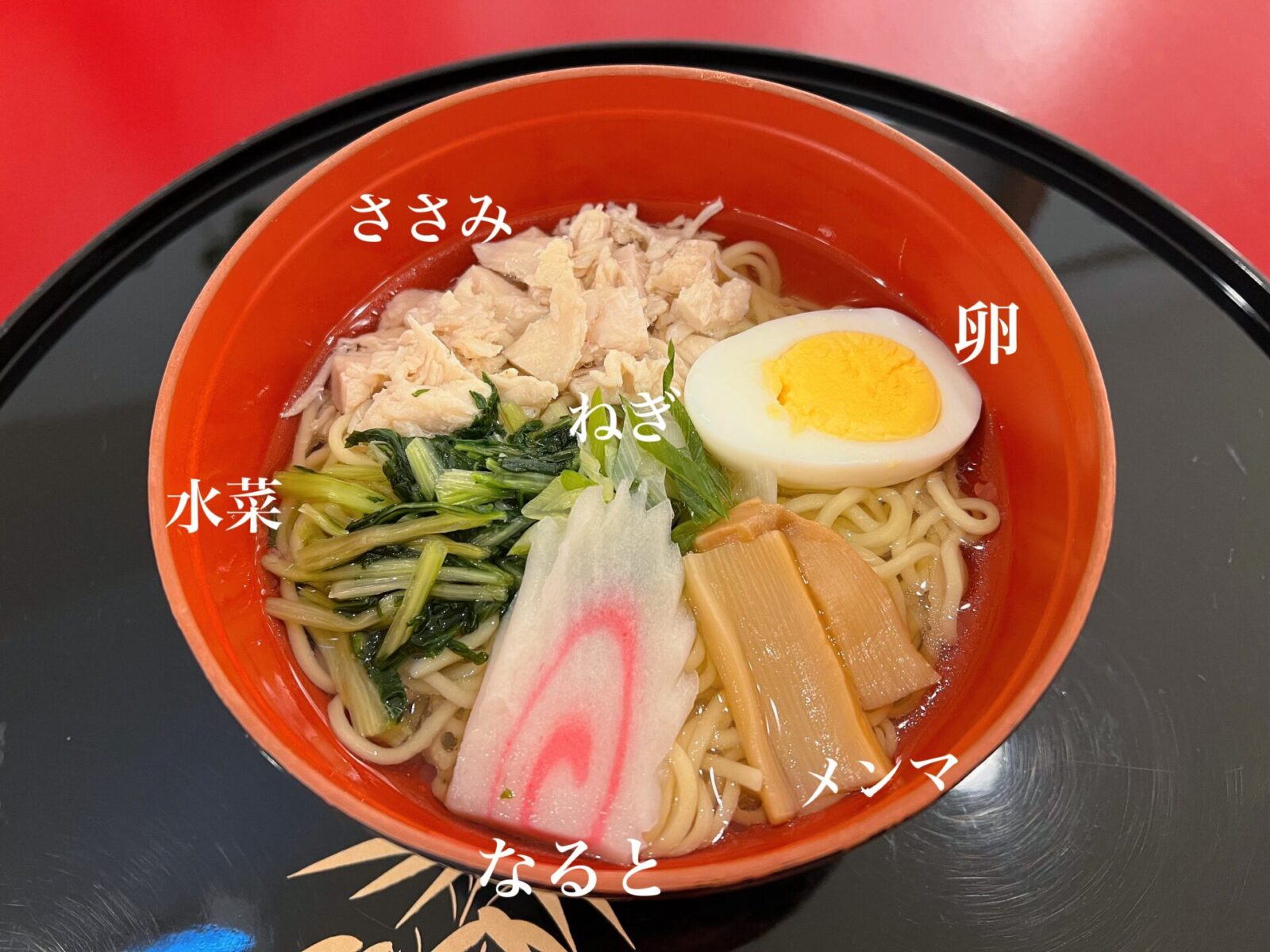 ささみ、卵、水菜、メンマ、ネギ、なるとなど具沢山のメニューになっています。