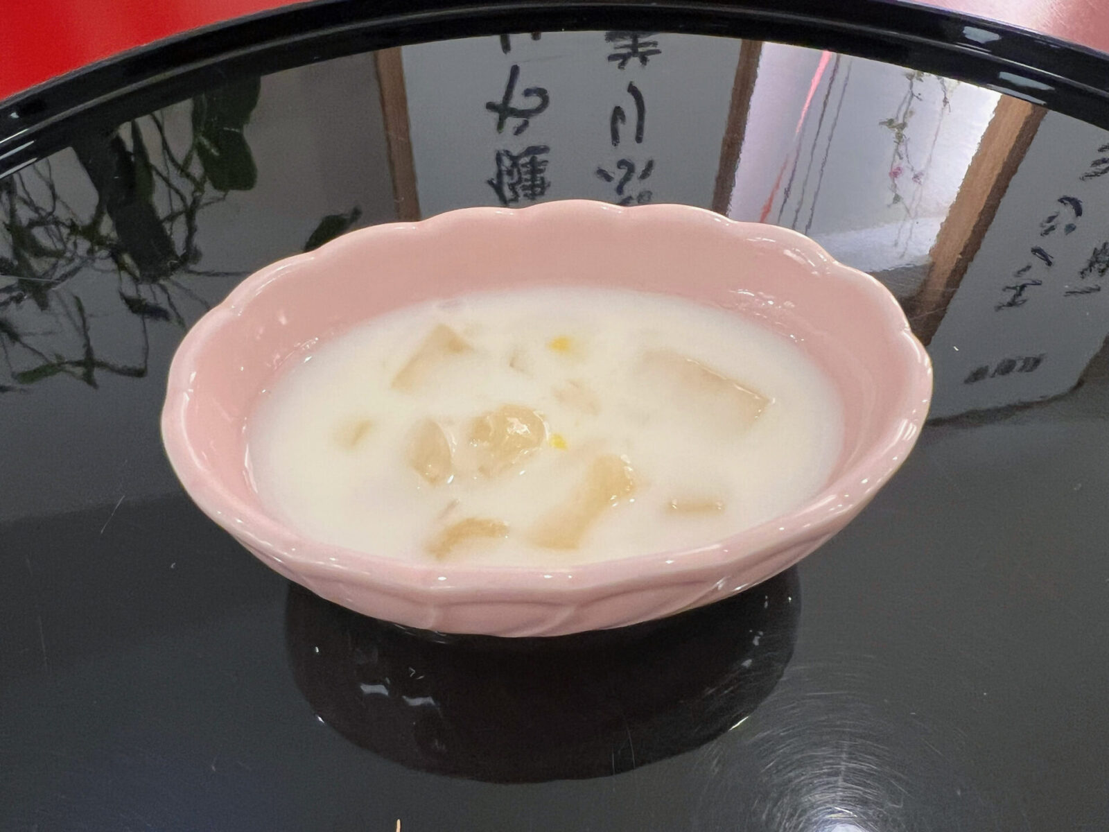 杏仁豆腐と白桃の相性よく、さっぱりといただきました😊