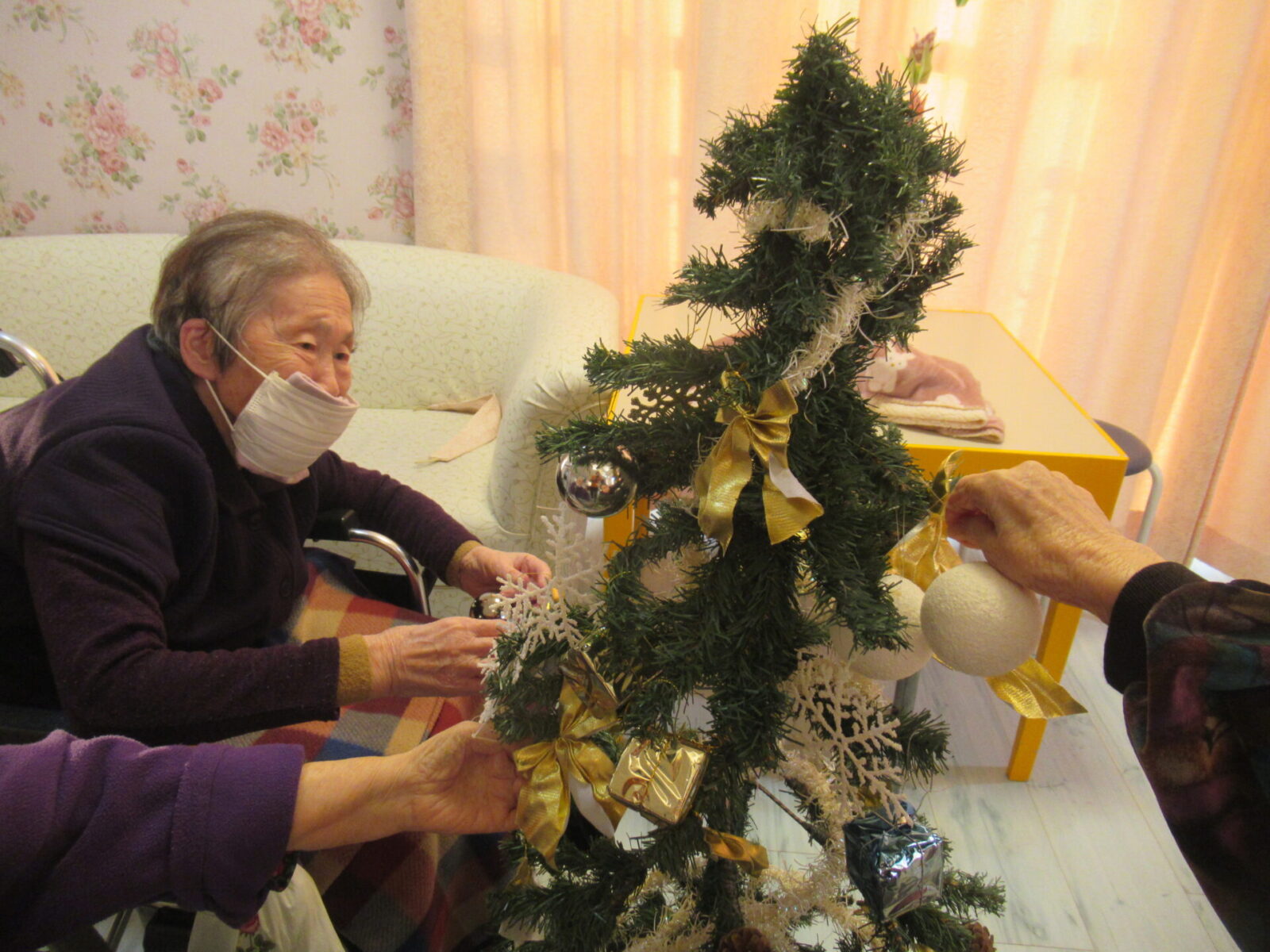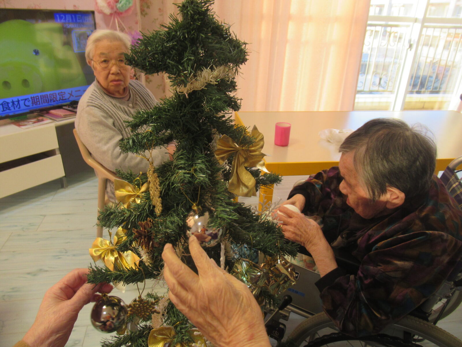 パライソサンクスでは、入居者様方がクリスマスツリーの飾り付けを行っておりました。